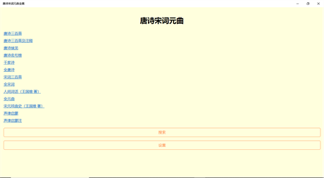 唐诗、宋词、元曲是中国文学发展史上一脉相承的三种文学体裁,其内容与形式、成就与影响,堪称中华文化之绝响。此应用程序将唐代诗歌、唐宋词与元代散曲汇成一集,呈献给广大古典文学读者及收藏家。
