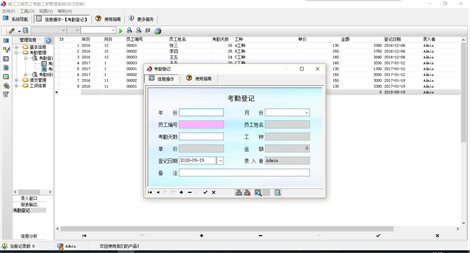 《施工工程员工考勤工资管理系统》是一款专门为建筑、水电暖等工程的员工考勤工资管理而开发的软件。系统主要包含基本信息、考勤管理、借支管理、工资结算四大模块,信息录入简单明了,查询统计功能强大,让您操作简便、提供效率! 系统包含以下四大部分: 1.基本信息:工种信息、员工信息; 2.考勤管理:考勤登记、考勤统计; 3.借支管理:借支登记、借支统计; 4.工资结算:工资结算(年份)、工资结算(月份)、工资结算(全员)。 软件特点: 1.支持数据与excel的导出与导入; 2.查询统计功能强大; 3.信息管理方便简单。 本产品为试用应用程序, 为试用版(也称为体验版或非注册版),可以长期使用,没有时间限制。该版本与正式版的区别仅打印功能受限制以外,其他在功能上和正式版的单机版在功能上是完全一样的。同时正式版还可以提供网络版,可以在互联网、局域网环境下使用,并同时支持电脑和手机等设备共享信息数据。确保应用符合用户的真正需求。该系统整体构架简单,用户容易上手,操作快捷、方便,性能高效、强大。本软件由宏达软件发布,宏达软件提供几十个行业的管理软件使用和产品二次开发服务以及各行业管理软件的定制开发服务。如果希望使用功能完整的版本,请与我们联系,购买收费的正式版,并获得更好的服务。另外系统的开发性比较好,支持二次开发功能。