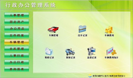 《行政办公管理系统》(中小企业行政办公管理解决方案),是一套适合于行政部门使用的行政办公软件。该软件可以适用于任何企事业单位,公司,工厂等各类机构的行政办公需求,软件包含了行政部门日常办公的所有业务。主要功能:固定资产管理,办公用品管理,人事管理,文件文档管理,车辆管理,仓库管理,请假,加班,考勤,值班,钥匙管理,员工嘉奖,会议室预定,票务管理,报销费用,外部通讯录,内部通讯录,工作计划等功能。 本管理系统多处具有快速辅助录入功能,操作简单,易学、易用;处理功能高效强大,是协助您的好帮手! 主要功能包含: 一、固定资产:固定资产登记,借用,归还,采购,维修,报废,标签打印,员工借用查询,员工离职固定资产归还 二、办公用品:办公用品登记,领用,采购,维修,报废,标签打印,员工领用查询 三、人事管理:人事管理,员工档案,培训,调薪调职,家庭成员,员工证件,员工奖罚,员工请假,离职 四、文件档案:公司证件,行政发文,会议文件,合同文件,外来文件 五、车辆管理:车辆管理,出车记录,车辆费用,维修记录,事故记录,违章记录 六、仓库管理:商品登记,入库,出库,最低库存警报 七、行政办公类:请假记录,加班记录,考勤管理,值班记录,钥匙管理,印章管理,员工嘉奖记录,会议室预定等,票务管理,电话费用,报销费用,快递记录,外部通讯录,内部通讯录,工作计划,面试人员管理 八、查询报表:资产统计,资产借用查询,资产采购查询,资产报废查询,资产维修查询,资产标签打印,员工查询,员工试用期查询,车辆费用统计,到期提醒查询 九、到期提醒查询:资产保养提醒,资产报废提醒,资产归还提醒,员工合同提醒,员工生日提醒,车辆投保提醒,车辆年审提醒,公司证件年审提醒.