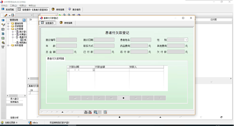 《诊所管理系统》是专门为社区卫生所、乡镇门诊制作的一款集病案、收费和药房于一体的管理软件。该软件功能包括:基础设置、药房管理、业务管理、财务管理四大模块。信息录入详细,查询功能强大,让您操作简便、提高工作效率! 系统包含以下四大部分: 1.基础设置:药品信息、供药单位、人员信息、收费项目; 2.药房管理:药品入库、期间药品入库统计、药品退货、期间药品退货统计、药品库存、药品库存(已过期)、药品库存(有效期内)、药品缺货提醒、药品溢出提醒; 3.业务管理:就诊登记、收费登记、患者欠款查询、期间患者就诊记录查询; 4.财务管理:付供药单位货款登记、欠供药单位货款统计。 软件特点: 1.支持数据与excel的导出与导入; 2.数据处理功能强大; 3.信息管理方便简单。 本产品为试用应用程序, 为试用版(也称为体验版或非注册版),可以长期使用,没有时间限制。该版本与正式版的区别仅打印功能受限制以外,其他在功能上和正式版的单机版在功能上是完全一样的。同时正式版还可以提供网络版,可以在互联网、局域网环境下使用,并同时支持电脑和手机等设备共享信息数据。确保应用符合用户的真正需求。该系统整体构架简单,用户容易上手,操作快捷、方便,性能高效、强大。本软件由宏达软件发布,宏达软件提供几十个行业的管理软件使用和产品二次开发服务以及各行业管理软件的定制开发服务。如果希望使用功能完整的版本,请与我们联系,购买收费的正式版,并获得更好的服务。另外系统的开发性比较好,支持二次开发功能。