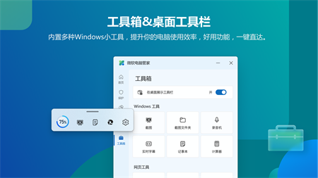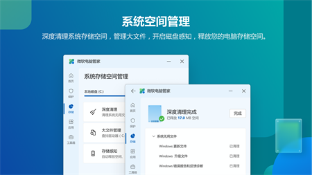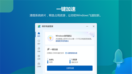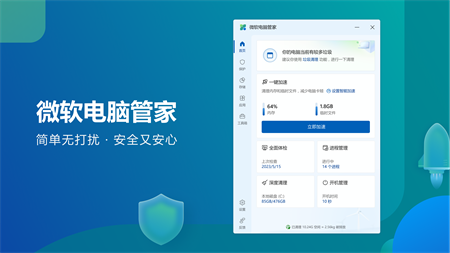 微软电脑管家由微软官方推出为用户提供的工具类产品。微软电脑管家秉承简洁流畅,高效安全,纯净无打扰的产品理念,提供一站式解决方案。保护用户的默认设置,并解决用户电脑空间不足、弹窗广告过多等问题。
