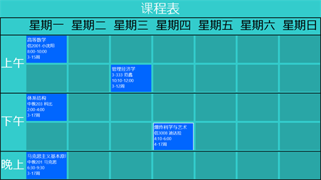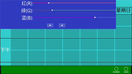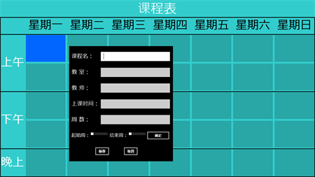 这是一个快乐的课程表,方便了每个大学生查看自己每周的课程情况。用户自己可以根据自己的课程情况来添加课程,修改课程以及删除课程,当然这些课程信息会被保存下来,方便下次查看。每个课程提供课程名称、上课地点、教师、上课时间和上课周数等信息。同时,我们也设计了应用界面的背景修改功能,可以根据用户自己的喜好,调节RGB三原色来获得自己喜欢的背景颜色。
