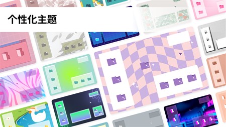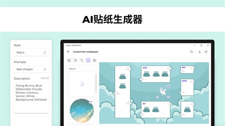 桌面定制: -选择壁纸、文件夹图标和光标效果; -更改背景大小; -更改文件夹表格; -添加文本并§编辑字体、颜色和大小; -使用AI添加生成的贴纸; -添加你的图像。