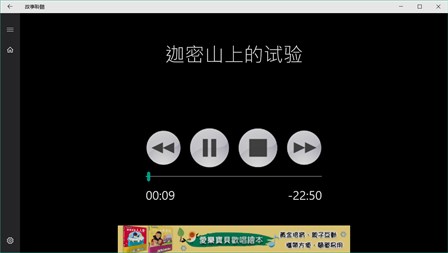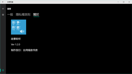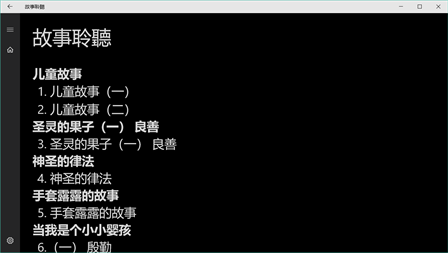 『故事聆听』有声APP收录台湾福音书房所发行之儿童教材有声书,包含“儿童故事”、“圣灵的果子(一)良善”、“神圣的律法”、“手套露露的故事”、“当我是个小小婴孩”等32则有声故事,适用于Windows 8平台。