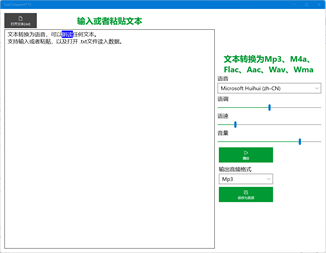 支持不同播音员朗读文字,需要更多语音需要下载。 支持转换前试听语音播放。 支持调整播放速度、语调、声音大小。 把语音保存为Mp3、M4a、Flac、Aac、Wav、Wma文件。
