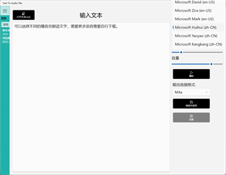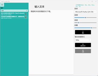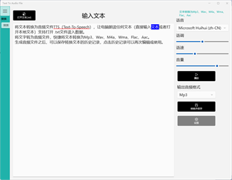 将文本转换为音频文件TTS(Text-To-Speech),让电脑朗读任何文本(直接输入文本或者打开本地文本)支持打开 .txt文件读入数据。 将文字转为音频文件,快捷将文本转换为Mp3、Wav、M4a、Wma、Flac、Aac。 生成音频文件之后,可以保存转换文本的历史记录,点击历史记录可以再次编辑或使用。