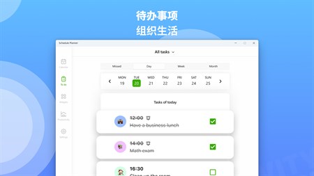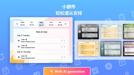 - 时间表:按小时计划你的一天; - 待办事项:列出清单,实现大目标,解决小任务; - 日历:使用日历提前计划; - 小部件:使用 AI 功能创建一个独特的小部件,并将其添加到桌面上。