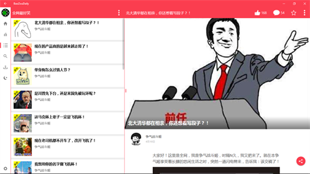 国内顶级搞笑漫画网站——暴走漫画倾力打造的高端之作,致力于每日推送优质、幽默的精品段子。 上班下班公交地铁必备消磨良品,大幅度提升幽默感赢取女神芳心的推荐装备,寂寞空虚寒冷夜的贴心小伴侣~ 不要让忙碌疲惫的生活消磨了你的幽默感,暴走日报——世界还可以更有趣!