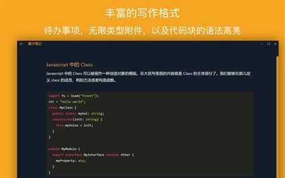 除了基本的写作格式外,app支持照片或文件插入,作为笔记附件永久存档并同步; 笔记内置待办格式☑️,您能够使用它来跟踪哪些项目已经完成,哪些还是待办; 如果您是程序员,您能够在这里珍藏各种代码,笔记编辑器内置的“代码块”格式会进行语法高亮。