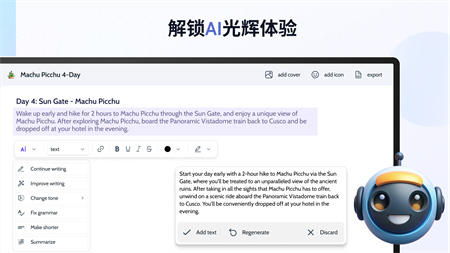结构化文本掌握: 通过AI功能, 块自定义和文本格式简化文本编辑体验; 从一系列的颜色和背景中选择,让你的文字充满个性