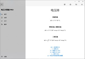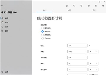 主要计算: 线芯截面积计算,电压降计算,电流计算,电压计算,有功功率计算,视在功率计算,无功功率计算,功率因数计算,负载阻值计算,计算阻抗,最大线缆长度计算,绝缘导线的载流量 [PRO],裸导体的载流量 [PRO],母线载流量 [PRO],导管管径计算 [PRO],断路器的选型 [PRO],电缆的允许通过能量 (K²S²) [PRO],工作电流,电抗 [PRO],阻抗由电阻和电抗组成 [PRO],功率因数补偿 [PRO],变压器MV/LV(高/低压)的功率因数校正 [PRO],不同电压下的电容器功率 [PRO],接地系统,最大短路电流 [PRO],短路电流最小值,变电站短路电流 [PRO],导体电阻,电缆温度计算 [PRO],电缆功率损耗 [PRO],色环电阻识别,色环电感识别,阻值转色环,贴片电阻识别,电容值代码,电感代码,熔断器,电阻求总,电容求总,LC谐振频率计算 [PRO],电阻分压电路 [PRO],分流器 [PRO],稳压二极管稳压电路 [PRO],分压电阻,LED限流电阻,电池寿命,变压器的一次/二次绕组,天线长度计算,闭路电视硬盘驱动器/带宽计算,温度传感器(PT / NI / CU,NTC,热电偶…) [PRO],模拟信号值 [PRO],焦耳效应损耗,大气引起的过电压风险评估 [PRO],光伏故障电流 [PRO]。