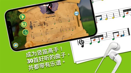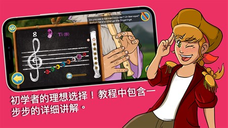 你将学习吹奏许多独特的乐曲,这些乐曲会逐步教你如何在竖笛上吹出每个音符。当你完成游戏的时候,你就可以成为吹奏竖笛的大师了!;)