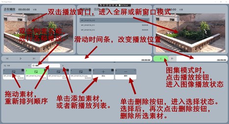 * 点击播放列表中的媒体文件,右侧预览区进行媒体操作,然后点击左侧播放按钮,开始正式播放状态。 * 双击两侧任一播放窗口,进入独立窗口或者全屏播放模式。 * 在时间条上滑动,可以改变播放位置。 * 拖动播放列表或者列表中的媒体文件,可以重新排列播放列表或者媒体播放顺序。 * 双击播放列表名称,可以修改列表名称。 * 点击删除按钮,进入选择模式。选择要删除的文件,再次点击删除按钮,删除被选文件。 * 在图集列表时,点击右侧播放按钮,进入图像显示模式,再次点击退出模式。