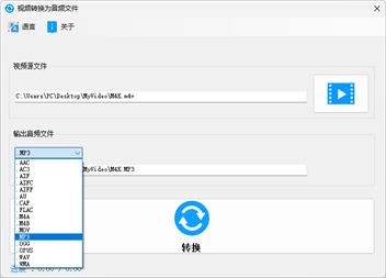 支持转换为音频格式: MP3,WAV,WMA,AAC,AC3,AIF,AIFF,AIFC,AU,CAF,FLAC,M4A,M4B,MOV,OGG,OPUS