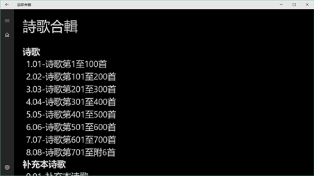 诗歌是人向着神最细嫩的流露。本『诗歌合辑』APP,适用于Windows 10平台。数字内容包含中文诗歌、福音诗歌、选本诗歌一百首、赞美诗集、台语诗歌、唱诗人选辑、儿童教材诗歌集、儿童诗歌及历年国际特会训练标语诗歌等77片诗歌CD,共787首诗歌,总长40小时。盼望帮助圣徒们在日常生活中,随时随处满了向主的歌唱、颂咏。