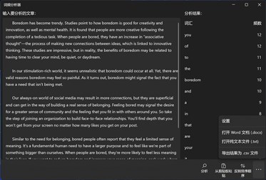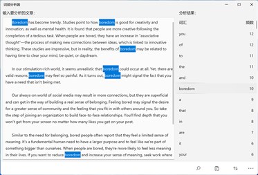 《词频分析器》是一款英语学习辅助工具。将您正在阅读的英语文章粘贴或输入到应用内,可快速分析出文章内所有词汇出现的次数。您可以将这些统计结果用于有针对性的词汇学习,比如,您正在备战一项英语考试,可以统计出一篇阅读理解真题文章的单词频数。频数较大的单词多为简单的介词、连词、代词等;频数位于中间的单词(除文章中反复出现的人名等)为重点高频词,或者代表了文章的主题,应该全部记住;频数为1的单词(除出现一次的地名等)如果能记住,将大幅提高阅读水平。 此应用程序还可以将统计结果导出为 .csv 文件,可使用 Excel 打开并作进一步分析处理。