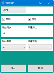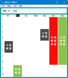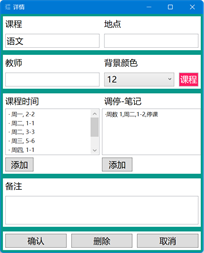 该软件用于记录多用户的课程表,可自定义每天课时数、是否显示周末、界面背景和字体等。课程数据独立于软件,方便用户间分享,支持导入导出excel文件。每门课程可设置上课时间、单双周、起止周数、当前周数、临时调停和课堂笔记等。