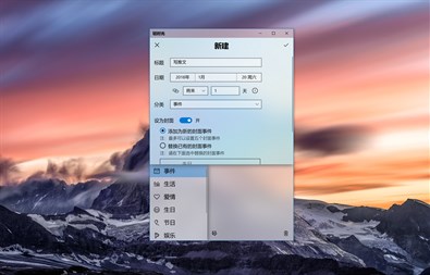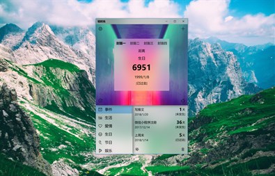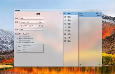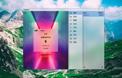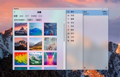 ⭐简洁明了的UI ⭐最新的亚克力与Fluent Design ⭐可分类的事件 ⭐内置了近30张精美原图壁纸 ⭐精美的封面事件