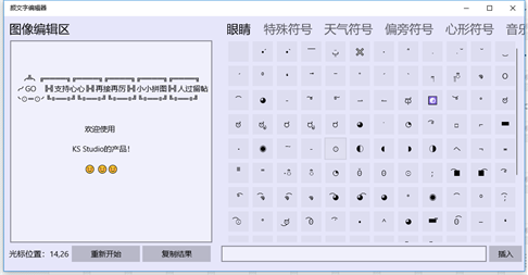 一款非常可爱的颜文字编辑工具,并内置了非常丰富的特殊字符。 ╭╩╮ ╔════╗╔════╗╔════╗╔════╗╔════╗ ╭╯GO ╠╣支持心心╠╣再接再厉╠╣小小拼图╠╣人过留帖╠╣请支持我 ╰⊙═⊙╯╚◎══◎╝╚◎══◎╝╚◎══◎╝╚◎══◎╝╚◎══◎╝ 欢迎使用 KS Studio的产品!