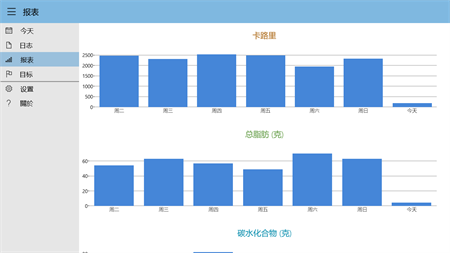 特點: 1.一個簡單且功能強大的設計:应用软件可以直接在螢幕上被打開然後轉入到最近使用過的菜單,因為那是你最會使用的。設計盡可以盡可能簡單和直觀盡的添加條目。 2.一個使应用软件個性化的建議: 立即可以選擇的最常見的食品。從開始的第二天,系統將主動提供你您最近使用的菜單,因為你可能經常吃同樣的食物。 3.不需要登入:不需要個人資料或聯繫信息。4.數以千計的菜單已經在資料庫中: 大部分食品已有準確的關於常見的食物份量、 卡路里、 碳水化合物、 蛋白質和脂肪的信息。 5.完全支持離線使用: 無需連接到 網絡。 6.精確進入也很容易: 您可以使用滑塊進入到的精確數額。 7.每日報告: 使用功能表,您可以直接打開日記,其中顯示了你的一天的總結。在這裡,你可以按小三角來切換卡路里、 蛋白質和碳水化合物。 8.跟蹤你的目標: 進入你的個人目標計劃表,通過每週報告來看看你的趨勢。 9.個人提醒使你緊跟你的目標: 這是一個確保你在每頓飯後或一天結束時填寫你的日記的方法。 這是一個驗證資料庫中的信息與食品包裝上的信息一致的好方法 ;隨著品牌和時間的推移食品營養將產生波動。請務必與您的醫生或營養專家討論你的目標。
