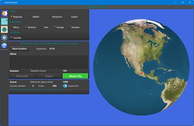 3. Where on Earth A very attractive geographical game, where you have to guess a location on a 3D-Earth, which rotates and tumbles to display that location in the middle. This game contains 4 levels (beginner, skillful, advanced and expert), 5 continents (Africa, America, Asia, Europe and Oceania) and 4 groups (capitals, large cities, towns and airports). Depending on the game level, you can select your answer from a choice between 3, 6, 9 or 12 locations. You can get additional help by requesting up to three hints. However, a hint lowers the points you can earn when answering the question.