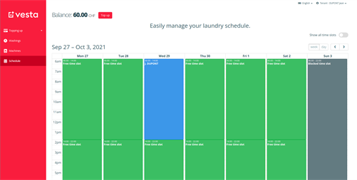 Check the availability of machines from your PC. Then go to the laundry room and activate the machine from the touch screen located near the machines, by typing your personal code, given to you when you registered. Once the wash cycle is completed, your balance is debited automatically.