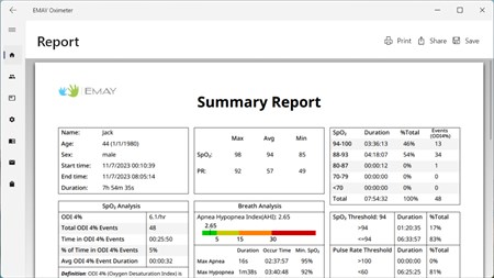 Specially designed for EMAY Pulse Oximeter to download, review and share report on your personal computer. 1. Allows users to transfer the SpO2 & heart rate data from EMAY Pulse Oximeter to the computers. 2. Review historical SpO2 & heart rate intuitively on the software. 3. Generate professional SpO2 report and share with others easily.