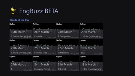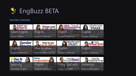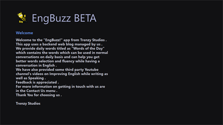 Welcome to the "Engbuzz!" app. This app uses a backend web blog managed by us . We provide daily words titled as "Words of the Day" which contains the words which can be used in normal conversations on daily basis and can help you get better words selection and fluency while having a conversation in English . We have also provided some third party Youtube channel's videos on Improving English while writing as well as Speaking . Feedback is appreciated . For more information on getting in touch with us are in the Contact Us menu . Thank You for choosing us .