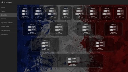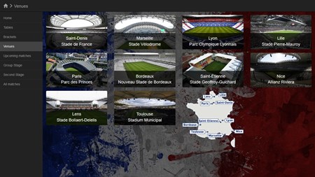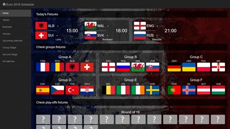 EURO 2016 France Timetable. Shows date and time of games in YOUR local time. Provides you with results of played matches updated daily. Shows list of upcoming matches, tables, venues and brackets. Modern design.