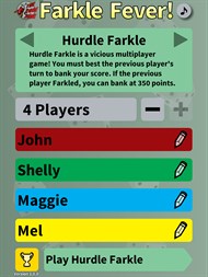 If you are a fan of dice games, this belongs on your list. Farkle Fever is a collection of six different great "press your luck" dice games that can be played solitaire or with up to four players. Included is the classic "Ten Thousand" version, as well as some high-bonus variations, a cutthroat version called "Hurdle Farkle", a "Farkle-less" variant called Zilch, and even one with a "push your luck" bonus.
