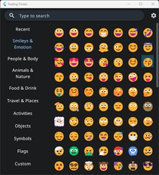 - Emojis from the Unicode spec - Variants / skin tones - Browse emoji categories - Hover emoji for description - Keyboard shortcuts - Start typing to search - Select emoji with arrow keys - Press `Enter` or click/tap an emoji to copy to clipboard - Right-click or `Menu` key to show variant / skin tone menu - `Alt` + `Arrow Up` / `Arrow Down` to change category - Option to quit after copying to clipboard - Right-click or long-press Recent to clear - Light & dark theme