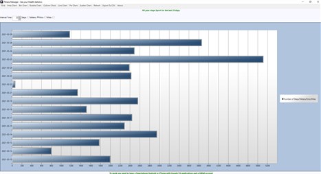This application allow to display your Sport statistics for all 60 days of activity retrieve by your Smartphone like Android or iPhone device. Possibility to consult your distance run in meters, kilometers and miles. Multiple charts available to view your performance. You can export all your steps datas in CSV format file. For work correctly, you need to have a Gmail account and the application Google Fit to install on your smartphone.
