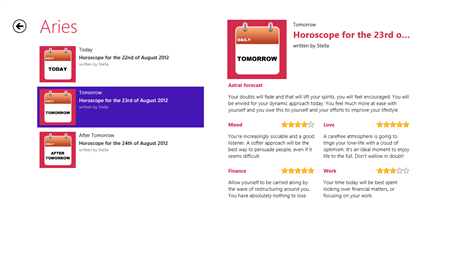 Discover the first Horoscope application in the Store ! Get for the 12 star signs your daily horoscope, plus tomorrow and the day after tomorrow's horoscopes, written by Stella, our professional astrologist. Your FREE horoscope is only a click away, download now this application !