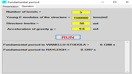 This program determine the proper period T of the fundamental mode of oscillation of a construction according to the STODOLA-VIANELLO method and according to the RAYLEIGH method.