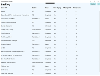 Features: Sort games by game title, system, status, now playing, difficulty, and time to complete. Wishlist