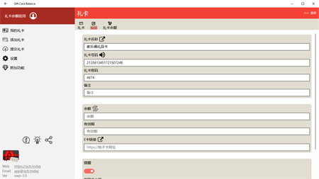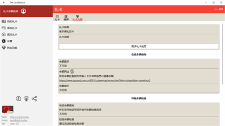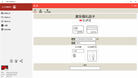 [主要功能] -管理礼品卡信息(自动或者手动) -添加礼卡、收据小品照片 -方便快捷的即时在线查询余额 -自动填充查询页面的信息 -自动读取查询页面礼卡信息(部分) -支持各种中国消费卡 购物卡 礼品卡
