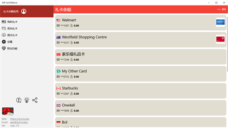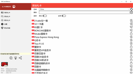 礼卡余额帮助你管理和查询各种购物卡、消费卡、现金卡的余额信息。绝大多数的礼卡支持在线余额查询。本应用帮助你快速找到官方查询网址并协助查询。