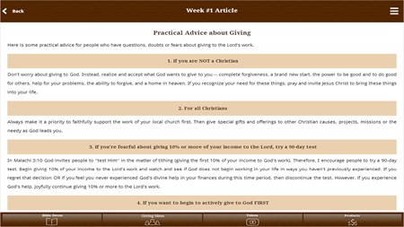 Based on the world's bestselling 40 Day Generous Life Bible devotional. 40 Daily Bible readings with key Biblical financial principles, 10 Bible verses, teaching podcasts, generosity story, and cartoon. Weekly videos and discussion questions for small groups and classes. 40 Giving-In-Action ideas for children, families, and groups. WISE GIVING Q&A videos, inspirational videos, and teaching videos. Great for personal use, couples, families, small groups and classes, or churchwide use.