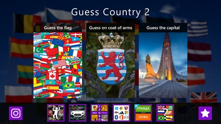The entertaining developing game Guess Country 2 will allow you to broaden the horizons and to spend time with interest! Guess the countries on a flag, the coat of arms or the capital, test yourself and the knowledge of geography ;)
