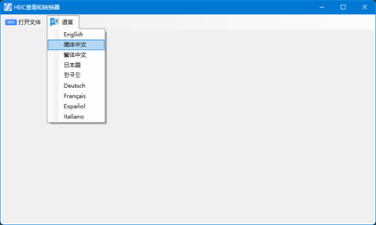 可放大与缩小查看Heic图像文件。 可将Heic格式转换为JPG,PNG,BMP,GIF,TIFF,WMF图像格式。 可切换多种语言使用。