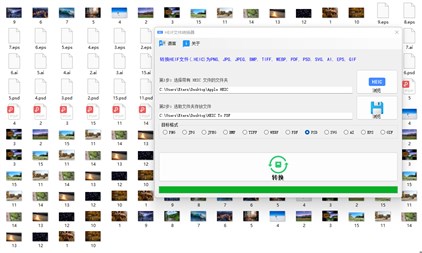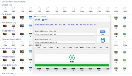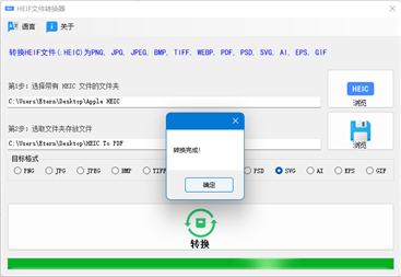 将HEIF(.HEIC )文件转化成其他图片格式,照片质量保持一致。 支持多个HEIC同时转为PNG、JPG、JPEG、BMP、TIFF、WEBP、PDF、PSD、SVG、AI、EPS、GIF等。 选择带有HEIF(.HEIC )文件的文件夹进行转换,整个文件夹内的HEIF(.HEIC )文件将会被快速转换为其它格式;更便捷,更省时间。 支持批量格式转换。 转换后的文件保存在选取的文件夹中。 转换进度可以查看进度条值,转换成功之后会弹出提示。