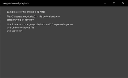 Play 48 KHz WAVs on your front height speakers, e.g. to test their audio fidelity (set speaker type in receiver to "Large" to prevent LF redirection). Requires successful activation of Dolby Atmos/DTS:X for home theater, on PC with the Dolby Access/ https://www.microsoft.com/store/productId/9N0866FS04W8 DTS Sound Unbound app https://www.microsoft.com/store/productid/9PJ0NKL8MCSJ Source code available at https://github.com/sonic74/Xbox-ATG-Samples