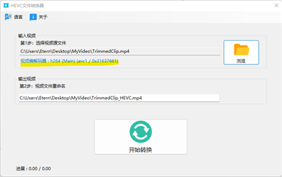 选取视频文件后,可以查看对应的视频编解码器。 选取视频文件后,我们会在原文件名称上加上"_HEVC.mp4"作为输出视频的新名称,当然您可以重新命名。