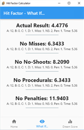 Advanced Hit Factor Calculator for IPSC and USPSA, offering the "What If..." feature which quickly calculates your possible Hit Factor without misses, without no-shoots and without procedural penalties and the "Dream Score" feature allowing you to play with different values free-style to see what your possible Hit Factor could be.