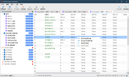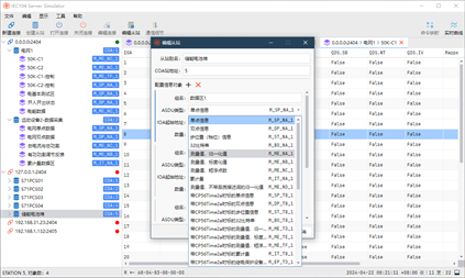 - 快速创建多个连接、多个从站设备 IEC104 Server Simulator 支持同时模拟多个从站/服务端,或者在单个连接中模拟多个站(公共地址);并且支持自定义APCI参数。 - 支持丰富的控制命令 支持单点命令、双点命令、设定值命令、自动时钟同步,定期支持总召命令、计数量召唤命令等;通过命令映射,自动修改数据。 - 完整支持 IEC 104/101 规约 支持所有的ASDU TypeID,包括监视方向上的过程信息、控制方向上的过程信息、监视方向上的系统命令、控制方向上的系统命令等。 - 常用工具 内置常用工具,校验和计算工具、字符串编码与解码工具、IEC104报文解析器。 - 监视链路数据 使用 IEC104 Server Simulator,您可以监视以太网上的详细的通信数据,帮助您快速调试与排查问题。 - 实时绘图 任意数量的测量值(归一化值、标度化值、短浮点数)、累计量绘制实时曲线,监控数据的变化趋势。