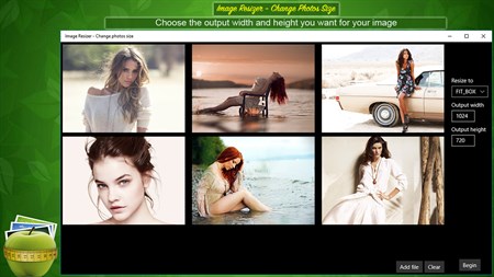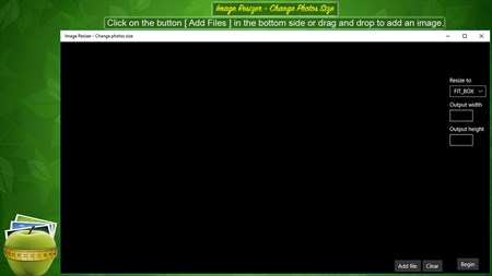 1. Click on the button [ Add Files ] in the bottom side or drag and drop to add an image. 2. In the left side of the application on "Resize to" area, you can choose if you want use fit box on your image or fill. 3. Right above, choose the output width and height you want for your image. 4. Click on the button [ Begin ] to resize and save. 5. Click on the button [ Clear ] if you don’t wanna use the current image anymore.