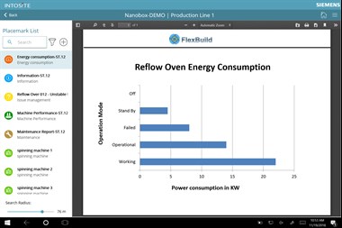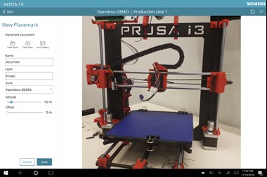 The application enables users to access information from Intosite when they are on the shop floor or at an outdoor facility, as well as upload information to Intosite. The information is presented based on the user’s location.