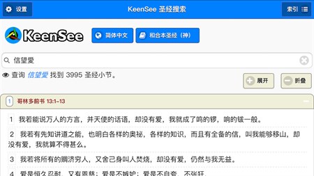 KeenSee圣经搜索可以帮助您找出圣经相关经文,支持英语、西班牙语、法语、和中文(传统中文及简体中文)的多个圣经版本。