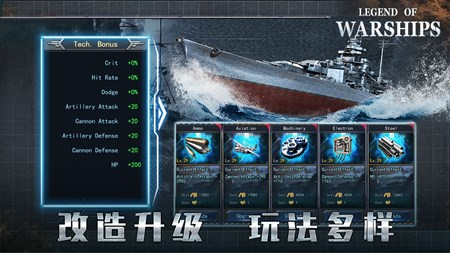 ——改造升级,玩法多样 除了精彩纷呈的海战,League of Battleship 还加入了战舰的改造和升级系统。玩家可以针对战舰的特点专门进行改造和升级,升级后的战舰不仅有着无与伦比的属性提升,还可以习得专属火炮技能,让战舰威力更加强大。