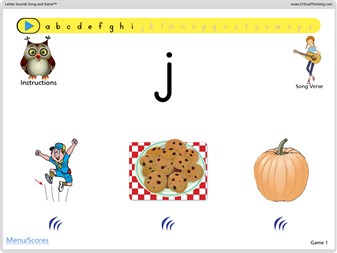 This software uses our popular Letter Sounds Song™ to teach students letter sounds. The first two games are designed to teach students the song, which in turn teaches them the letter sounds and words that begin with each letter. After learning the song, students learn to: • Identify the letter that makes each letter sound. • Identify a word (not in the song) that begins with a target letter's sound. • Identify the letter that makes the beginning sound in words that are not in the song.